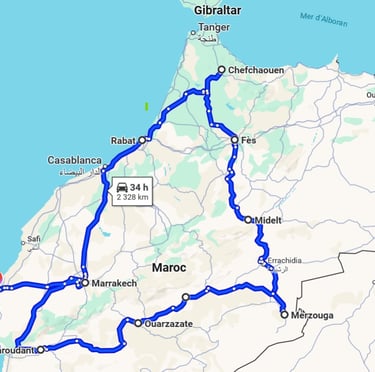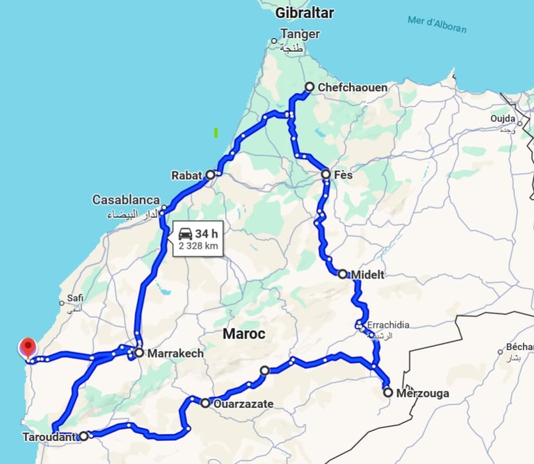 Extraordinaire voyage au Maroc. Près de 3000 km de route. Les paysages sont variés, les montagnes colorées et impressionnantes, le Sahara qui vaut le détour et pour terminer, la mer et ses plages à perte de vue.