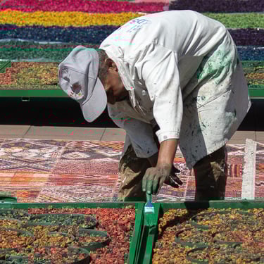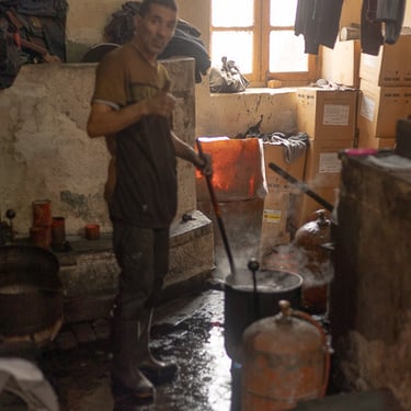 Le processus a très peu évolué depuis l'époque médiévale. Les peaux sont d'abord trempées dans un mélange d'urine de vache, de chaux vive, d'eau et de sel. Ensuite, elles sont trempées dans un mélange d'eau et d'excréments de pigeon. Eh oui ! L'excrément de pigeon contient de l'ammoniaque qui agit comme adoucissant.