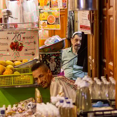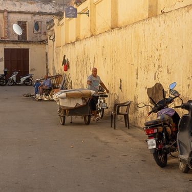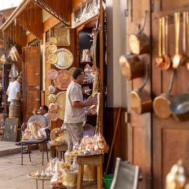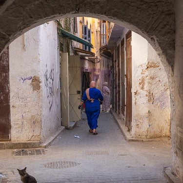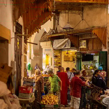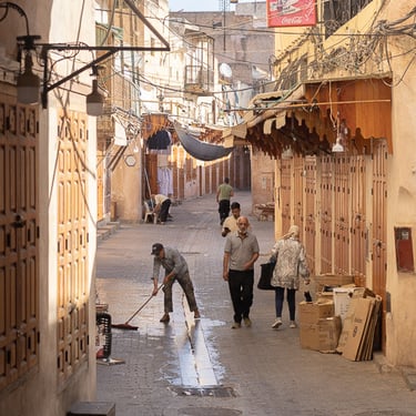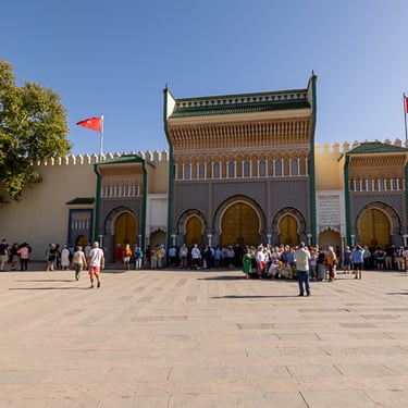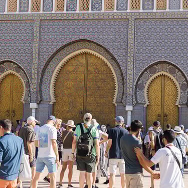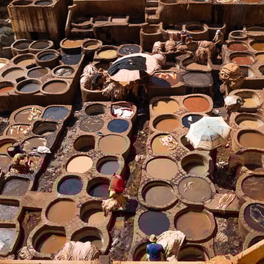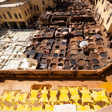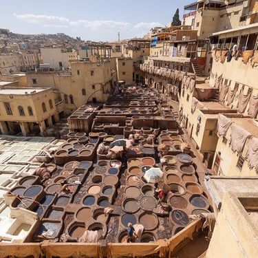 Fès est considérée comme le centre spirituel du Maroc. Nous avons découvert la médina (vieille ville) classée au patrimoine mondial par l'UNESCO, accompagnés de notre sympathique guide Hadj. Cette ville est célèbre pour ses articles de cuir qui proviennent du souk des tanneurs. Nous avons visité la plus ancienne et antique des trois tanneries, celle de Chouara. On y retrouve de nombreux vases en pierres remplis avec des teintures de différentes couleurs. Les peaux traitées sont celles de vaches, chèvres, moutons et dromadaires.