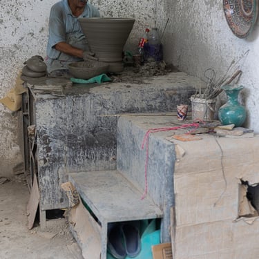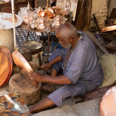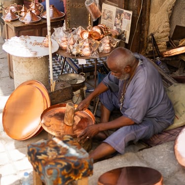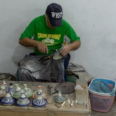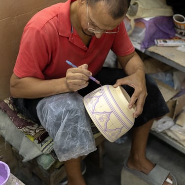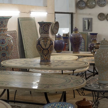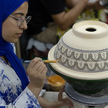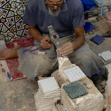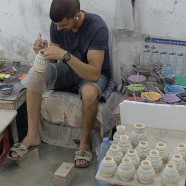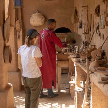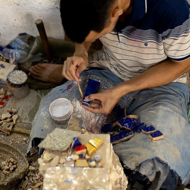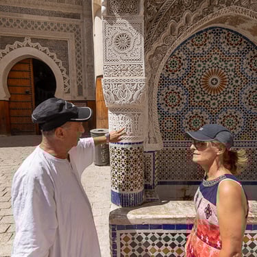 Visite d'un centre de formation professionnelle des arts traditionnels à Fès. Ce centre d'art forme les étudiants à la technique et aux secrets de la marqueterie marocaine.